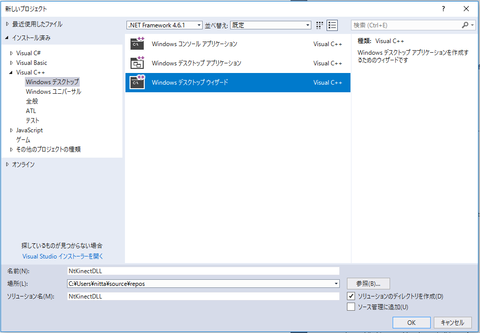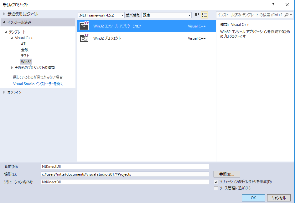 名前はここでは NtKinectDll とします。ソリューション名も自動的に NtKinectDll となります。 "OK" を選択します。