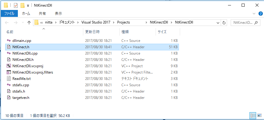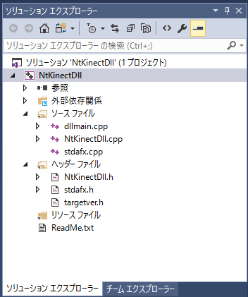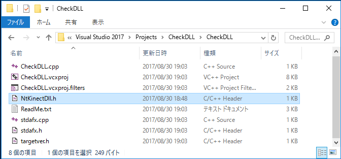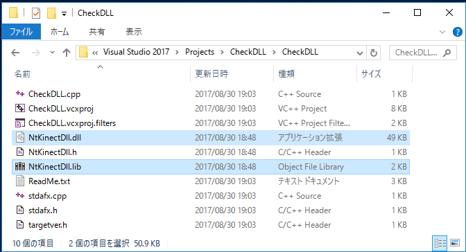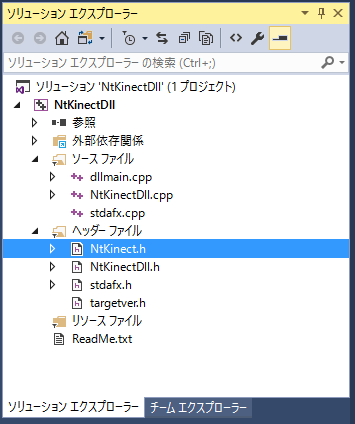 プロジェクトの stdafx.cpp や CheckDLL.cpp が置かれているフォルダに NtKinectDll.dll と NtKinectDll.lib をコピーします。