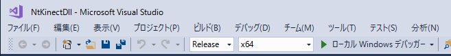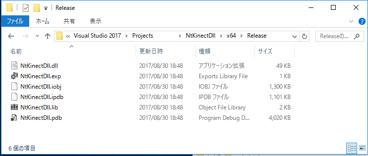 [注意2] .lib ファイルと .dll ファイルが生成されるのは プロジェクト直下のフォルダ (プロジェクト名)/x64/Release です。 ソースファイルが置かれているフォルダの下の (プロジェクト名)/NtKinectDll/x64/Release ではありません。