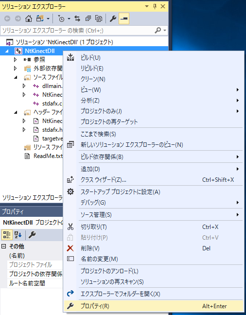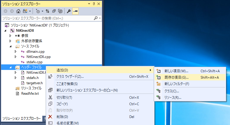 上記のリンクから NtKinect.h をダウンロードして下さい。 dllmain.cpp などプロジェクトのソースが置かれているフォルダ(この例だと NtKinectDll/NtKinectDll)に NtKinect.h を配置してから、 「ソリューションエクスプローラ」の「ヘッダーファイル」の上で右クリックで 「追加」 -> 「既存の項目」 -> NtKinect.h を選択します。