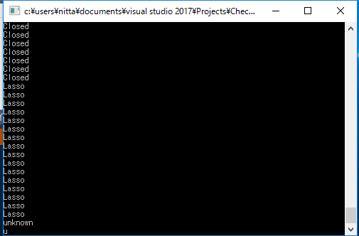 DLLの関数を実行するときは、ヒープ上のNtKinectオブジェクトのポインタを渡してもらい、 (void *)型のポインタから (NtKinect *)型のポインタに変更してNtKinect の機能を利用します。 下の例では関数中では kinect 変数は (NtKinect *)型のポインタになるので、 たとえば rgbImage というメンバ変数へのアクセスは (*kinect).rgbImage と記述します。 int rightHandState(void *) 関数では、まず カメラで取得した画像を1/16に縮小してその上に関節を赤で描画しcv::imshow()で表示しています。 ウィンドウの内容を正しく表示させるためにはcv::waitKey(1)を呼び出す必要があります。 その後で、認識できた誰か一人の右手の状態を返します。 返り値の意味は以下の通り Kinect.h で定義されている値です。