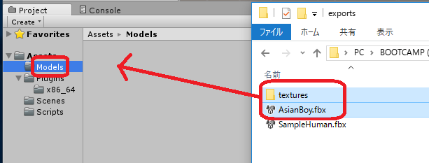 上記ファイルを展開するとexports/の下に AsianBoy.fbx と textures/ があるはずです。 これを Assets/Models/ の下にimportします。
