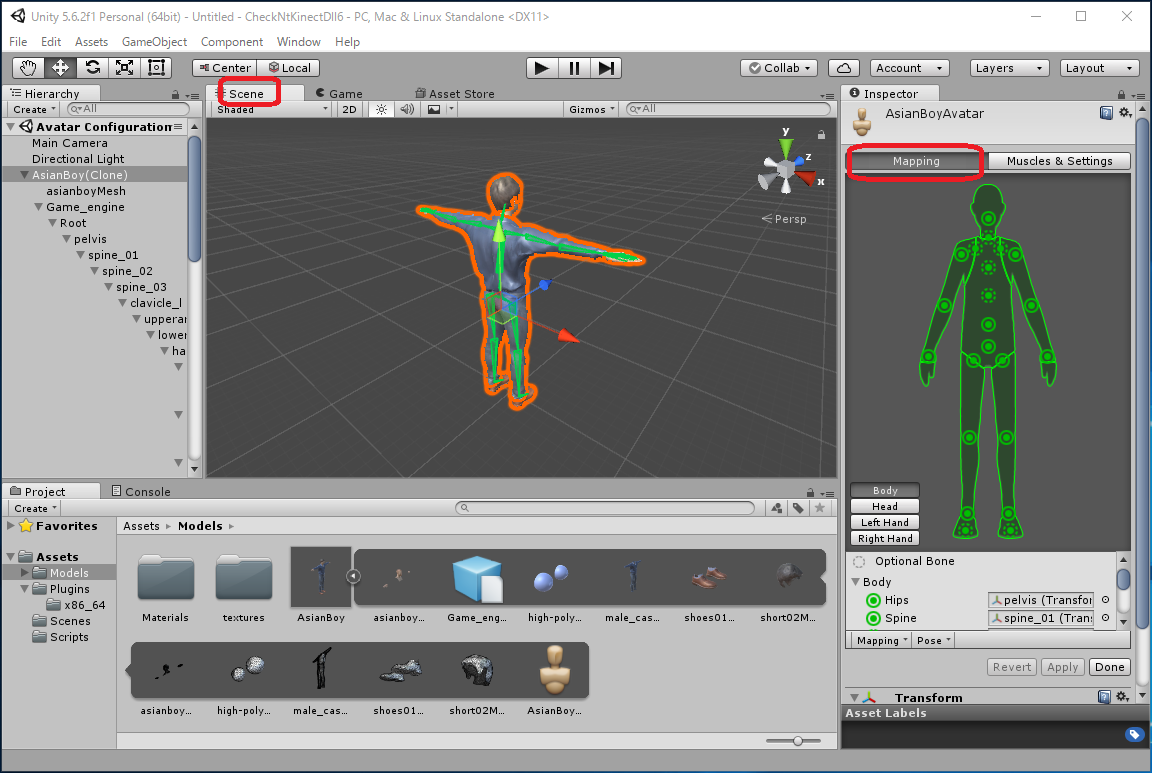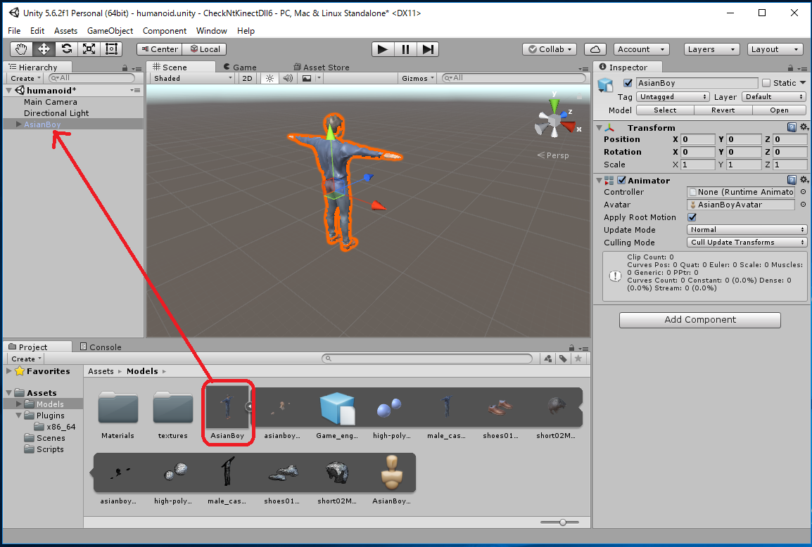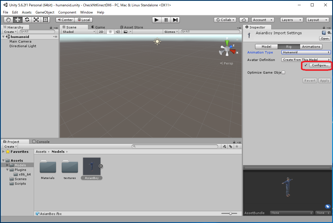 Assets -> Import New Asset... -> AsianBody.fbxから行なってもよいのですが、これだとAsianBoy.fbx に必要なtextureが 自動ではimportされず、モデルが真っ白になってしまいます。 この場合は Assets/Models/Materials/に生成された白いMaterialに対応する Textureを手動でimportしなくてはいけません。