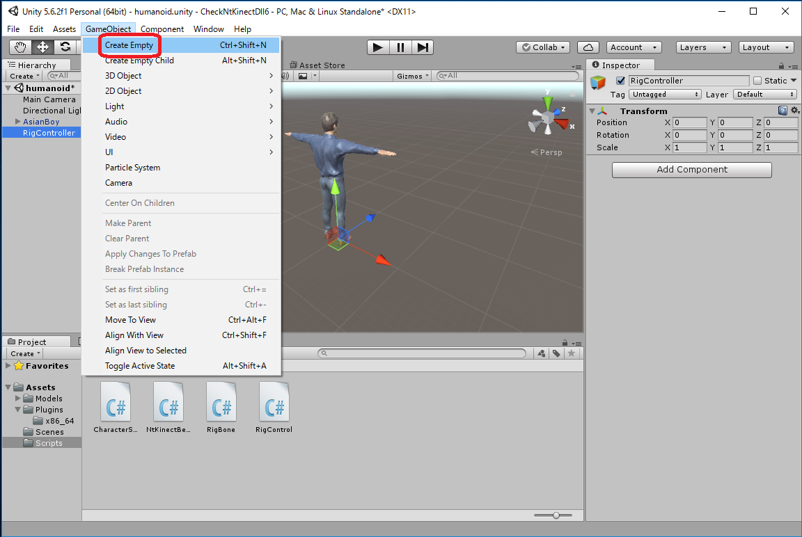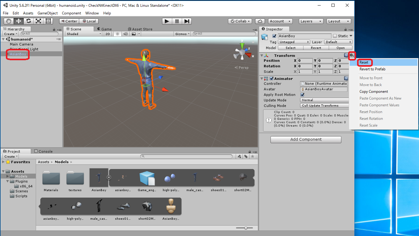 Humanoid の transform.rotation の値をプログラムで変更するので、 AsianBoy の Transform の Rotation の初期値はなんであっても構いません。
