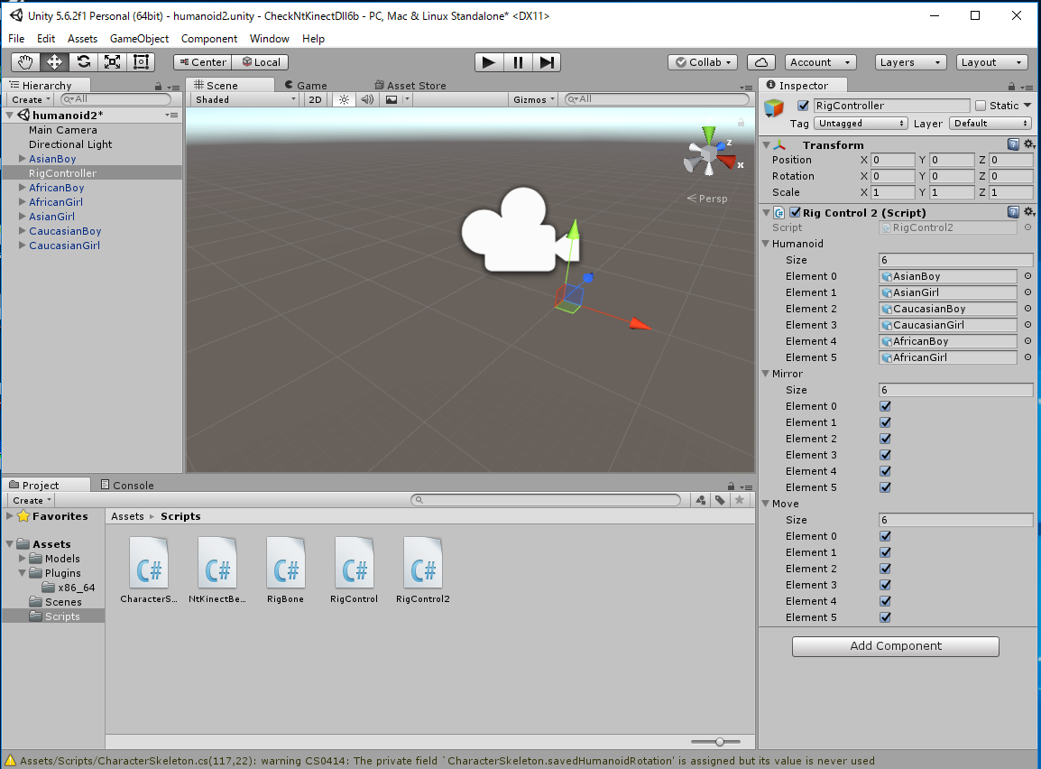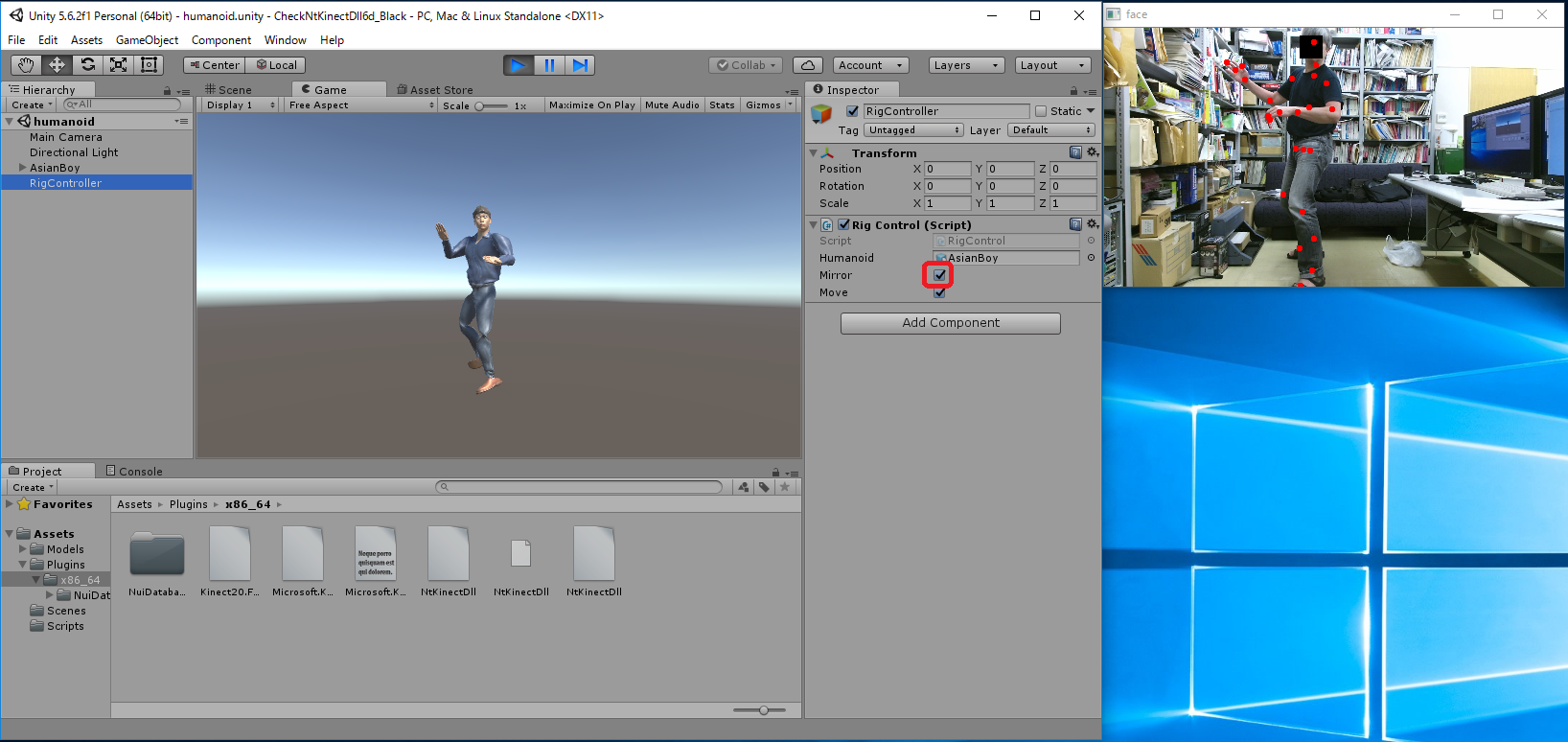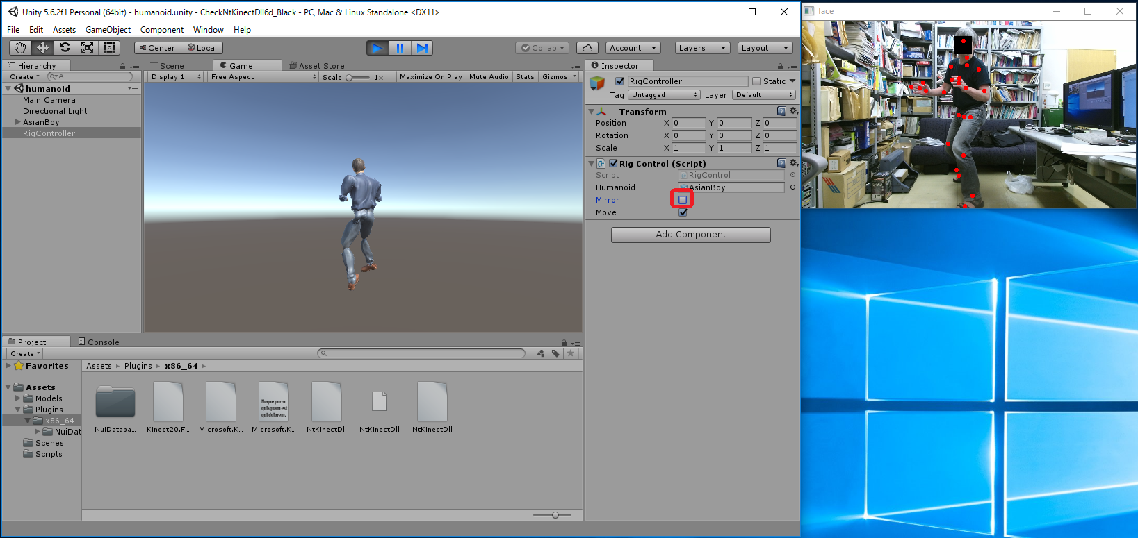 RigController に付加されている "Rig Control (Script)" コンポーネントの mirrored がチェックされていると、 人間の鏡像の動きに追随します。 mirrored のチェックをはずすと Humanoid はカメラに背を向けて、人間の動きに そのまま追随するようになります。 (注)実行中のUnityのウィンドウの右に小さく表示されているKinect V2の認識中の画面は すでに鏡像になったものです。