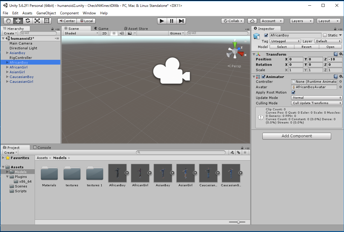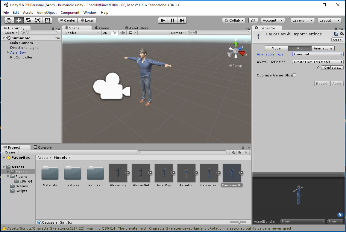 ここでは makehuman で作成した次のデータ makehuman2.zipを使います。 AfricanBoy, AfricanGirl, AsianGirl, CaucasianBoy, CaucasianGirl および texture/ をそれぞれimport して、Animation Type を Humanoid に変更します。