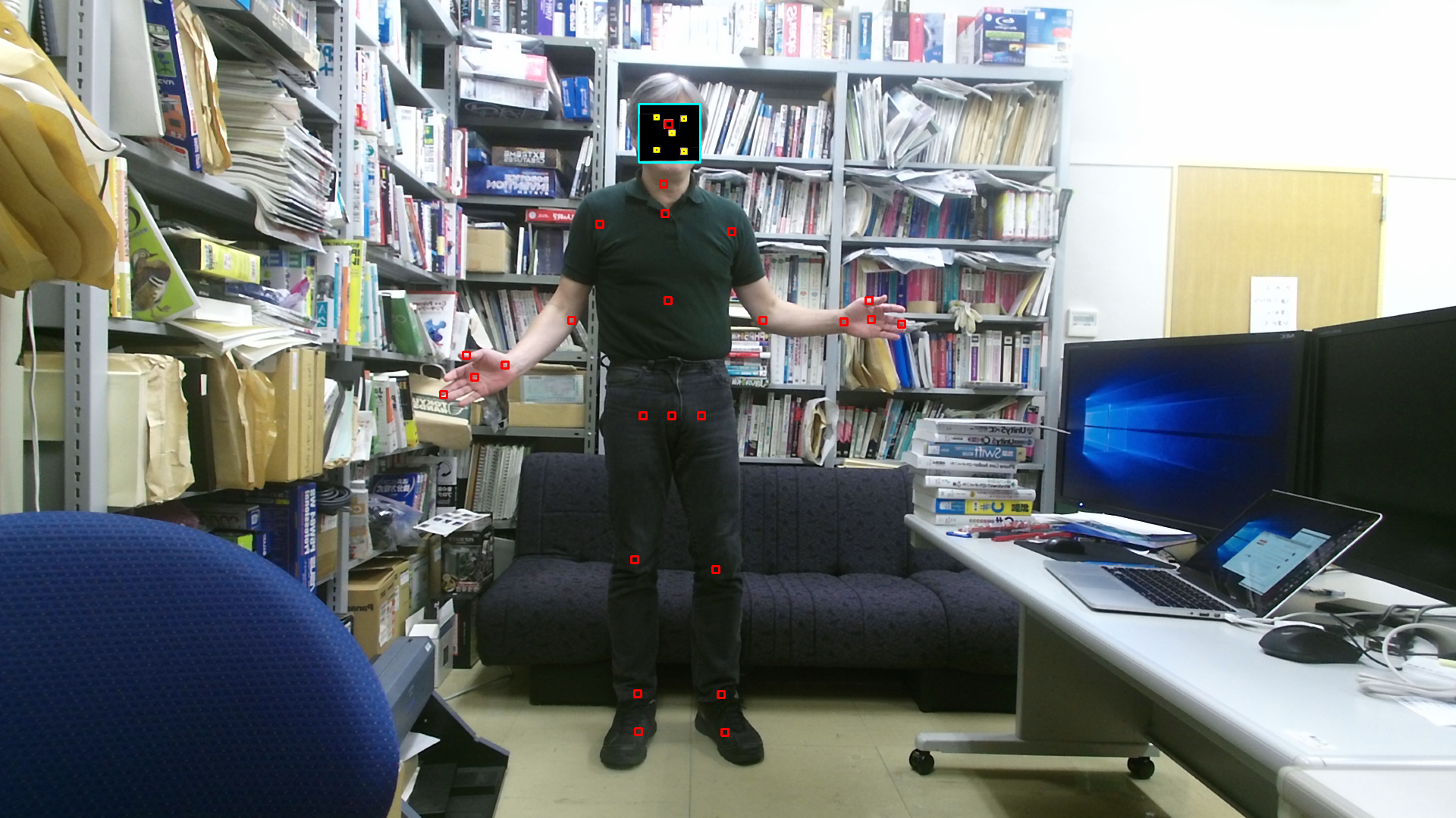この例では、顔の矩形領域をシアン色の四角形で表示し、 また顔の部品(左目、右目、鼻、口の左端、口の右端)の 位置に黄色の四角形を書いています。