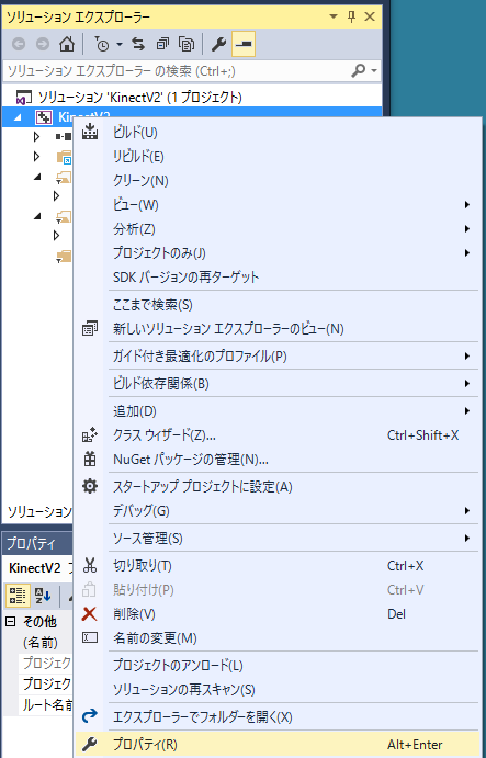 3. ソリューションエクスプローラのプロジェクト名の上で右クリックしてメニューからプロパティを選択します。