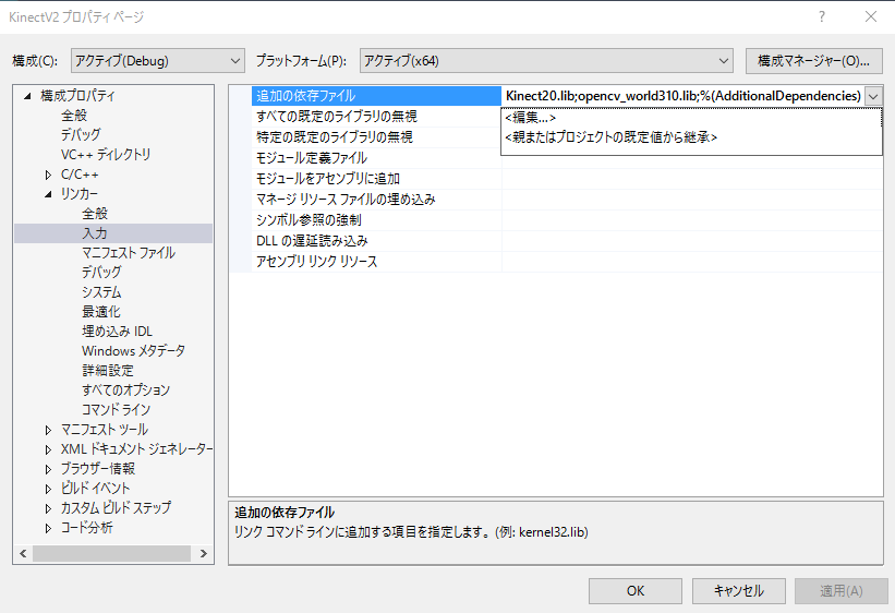 「構成プロパティ」の「リンカー」の「入力」の「追加の依存ファイル」を選択して、「編集」を選びます。
