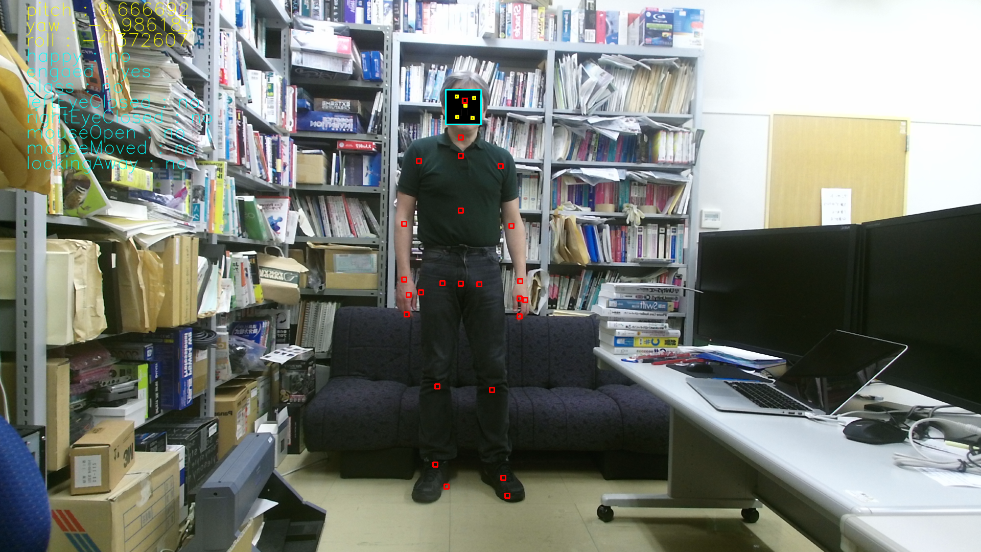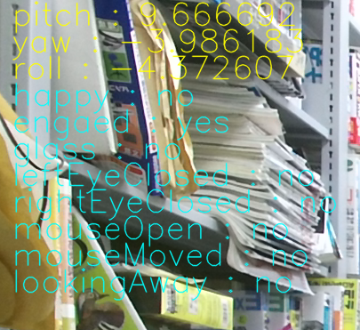 ウィンドウの左上に顔の向き(pitch, yaw, roll) や表情を認識した項目が表示されています(字の色が薄くて読みにくいです。すみません。)。