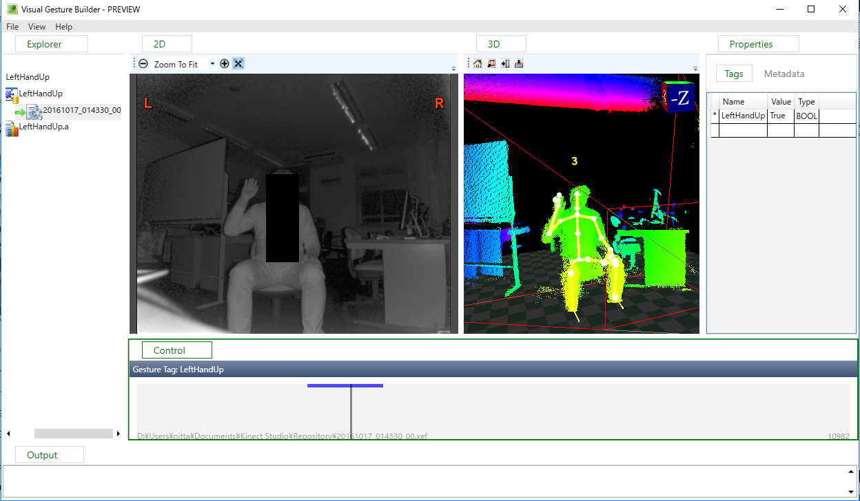 次に、Visual Gesture Builder を用いて、動画からジェスチャ検出用ファイルを生成します。 ユーザが手動で、 動画のうち「左手を肩よりも上に上げる動作」をしている部分を positive 、 他の部分を negative な状態として定義し、Visual Gesture Builder に機械学習 させると結果として ジェスチャ検出用ファイル LeftHandUp.gba が生成されます。