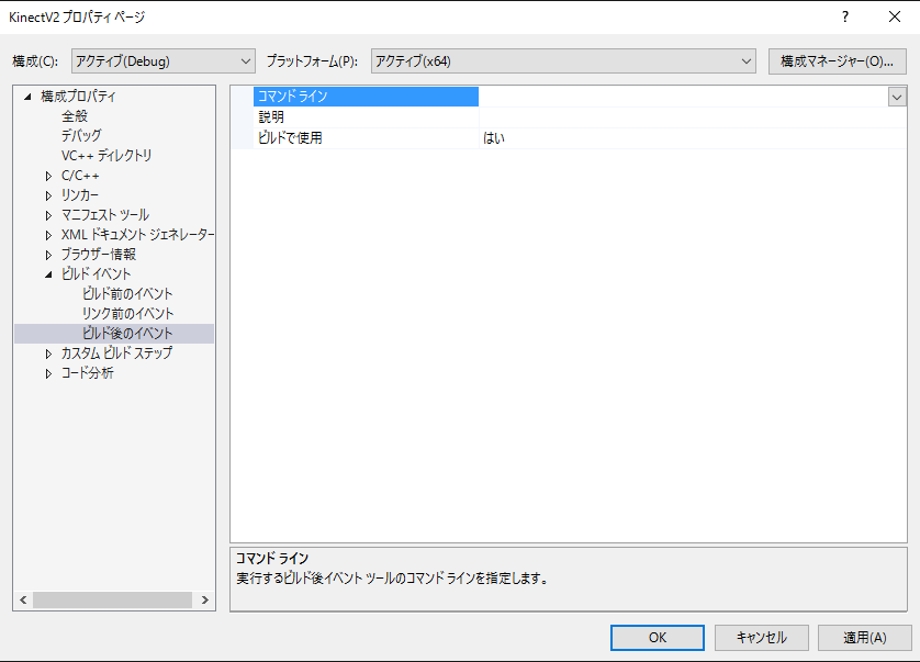 「構成プロパティ -> ビルドイベント -> ビルド後イベント -> コマンドライン」 で次の2行を追加する。