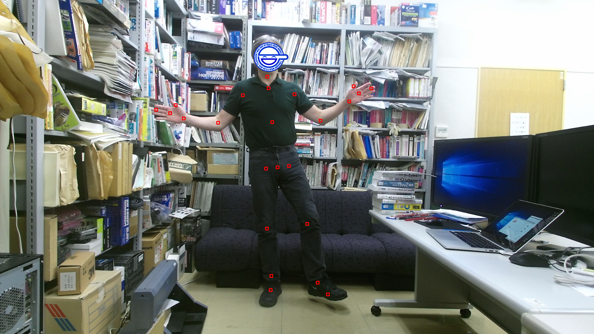 RGB画像の上に、認識された関節が赤い四角形で示されます。OpenCVでは色をBGRの順番で表現するのが 普通なので cv::Scalar(0,0,255)は (青, 緑, 赤)=(0,0,255)、すなわち赤を表していることに注意しましょう。