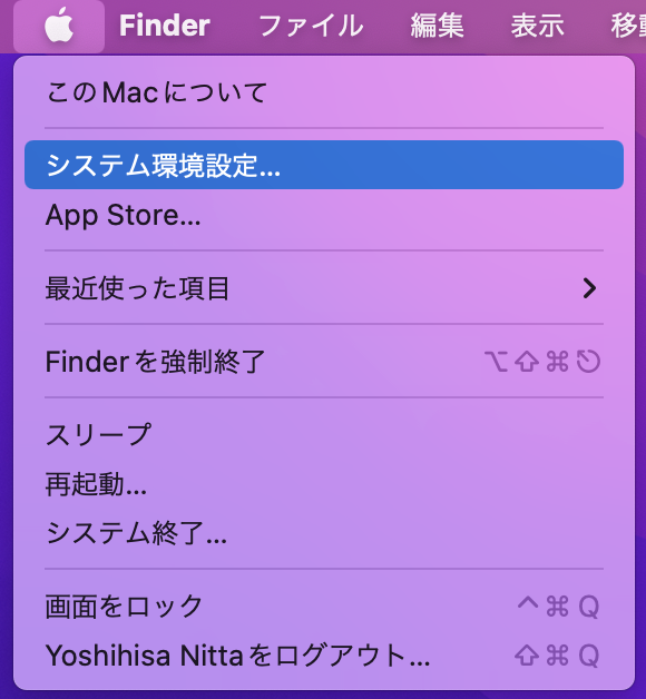 - 画面左上メニューの「りんご」から「システム環境設定」を選ぶ。