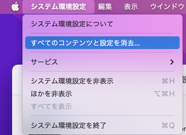 - メニューバーの「システム環境設定」から「すべてのコンテンツと設定を消去」を選択する。
