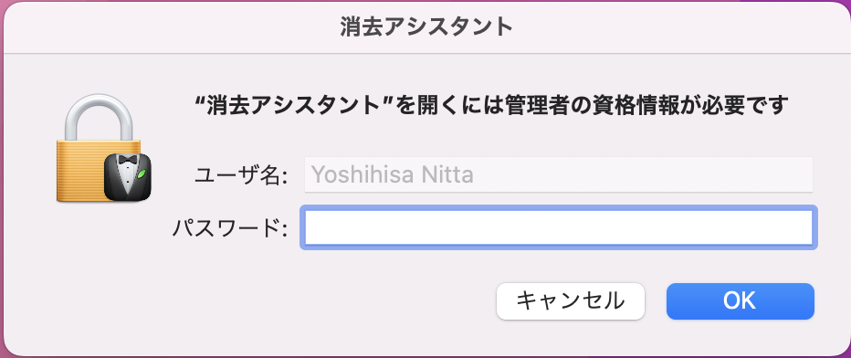 - 「消去アシスタント」が起動するので、管理者のユーザ名とパスワードを入力する。