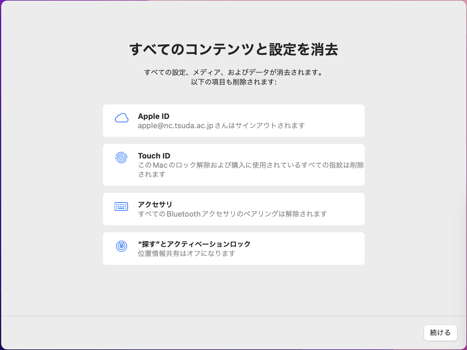 - 「すべてのコンテンツと設定を消去」のウィンドウがポップアップして、消去される項目がリスト表示される。「続ける」をクリックする。