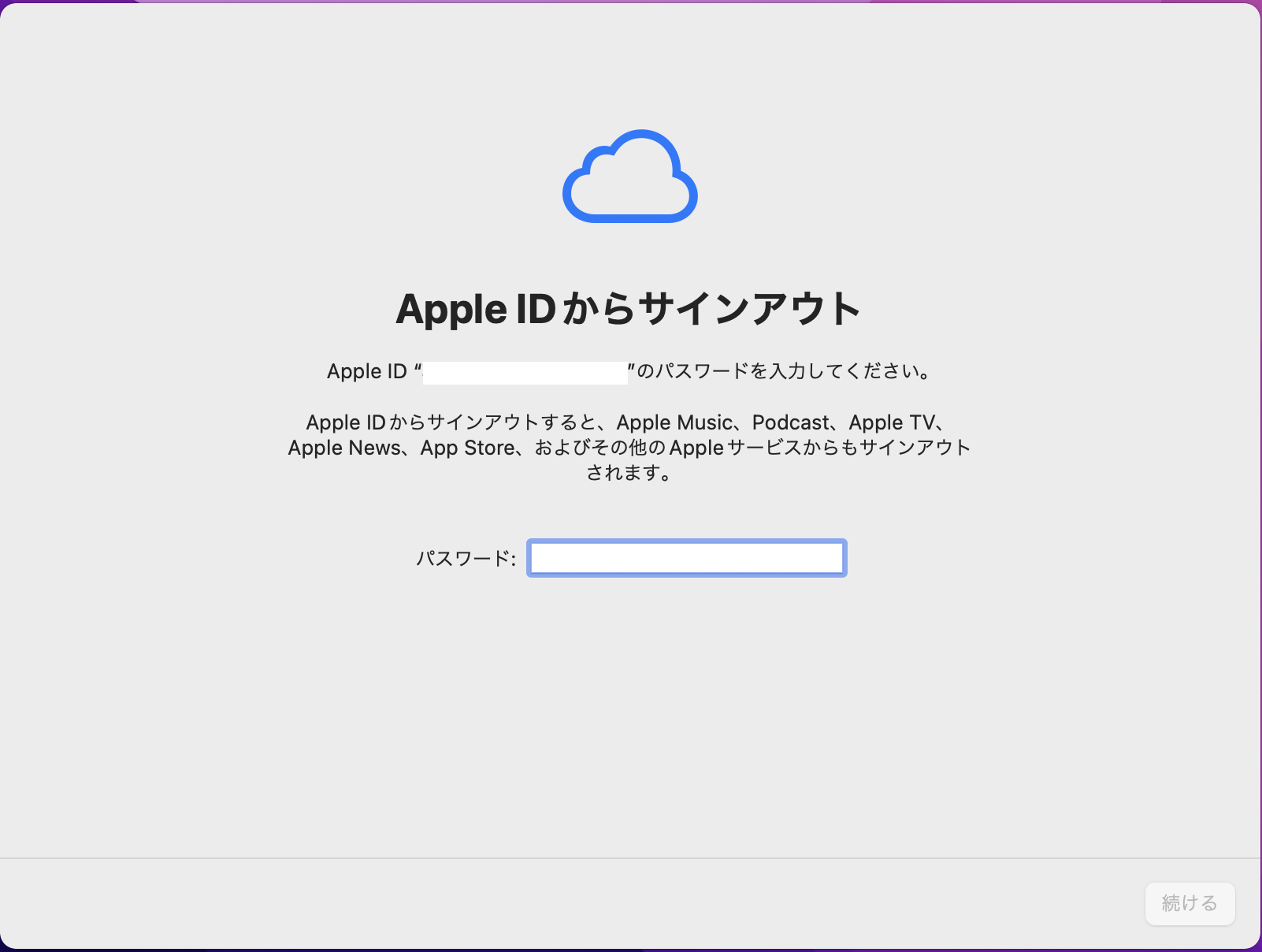 - 「Apple ID からサインアウト」のウィンドウがポップアップするので、自分の Apple ID のパスワードを入力する。