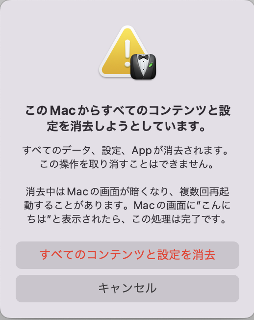 macOS Monteley 12.3 以降では、「すべてのコンテンツと設定を消去」が使える。