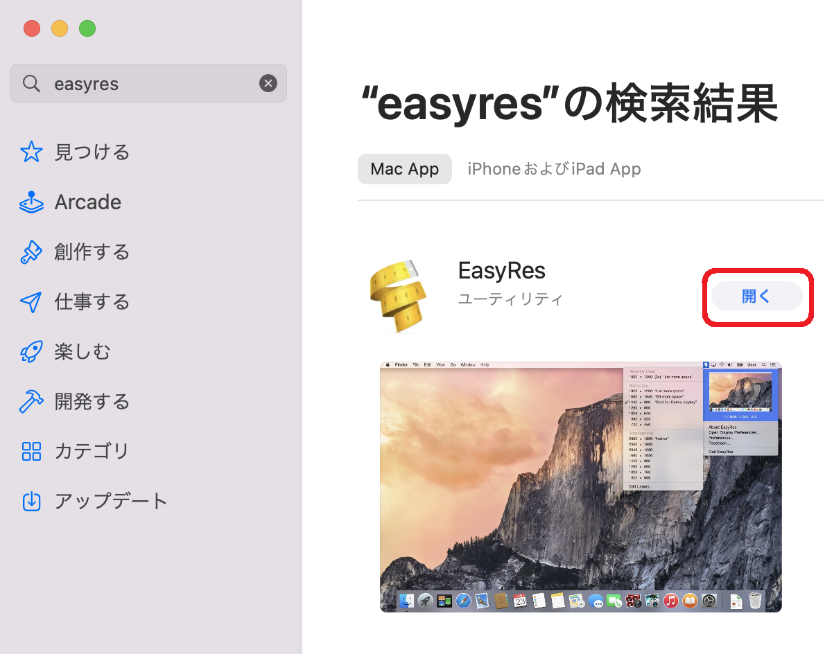 AppStore ウィンドウの左サイドビューにある検索窓で easyres を検索し、検索された EasyRes ユーティリティをインストールする。