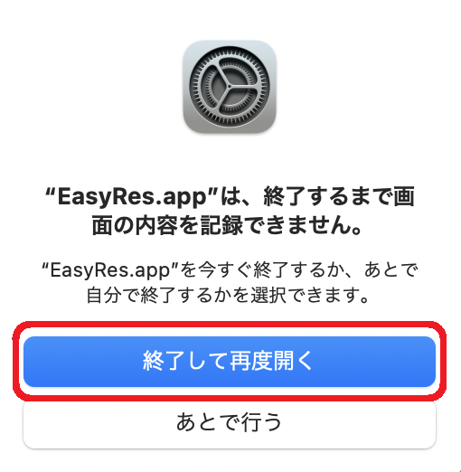 - 警告が表示されるので、新しいセキュリティ基準を直ちに EasyRes.app に適用するために「終了して再度開く」を選ぶ。
