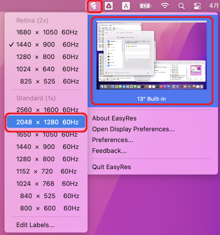 - EasyRes の動作中は、画面上のメニューバーの EasyRes のアイコンを選択して、各画面の解像度を選択する。