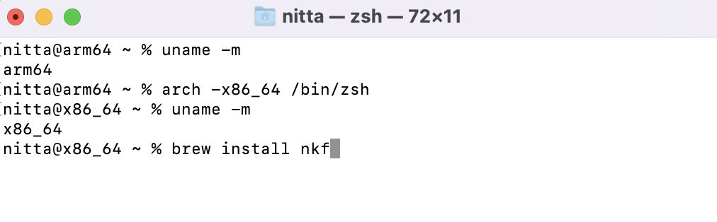 % arch -x86_64 /bin/zsh (x86_64)% brew install nkf