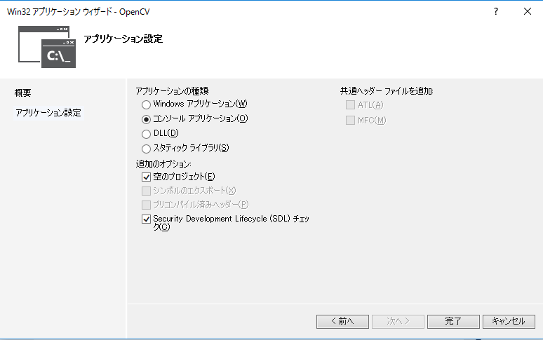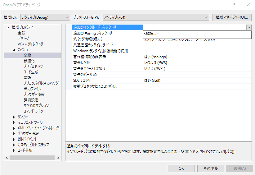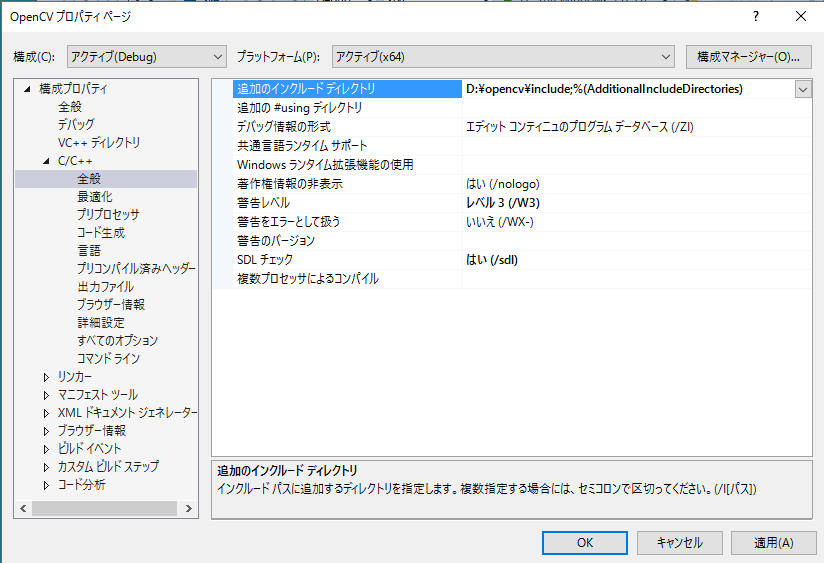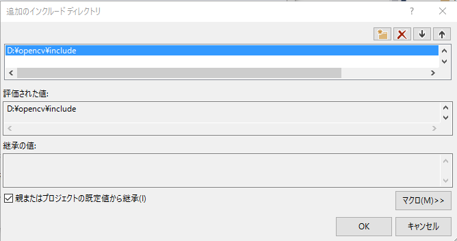 | インクルードファイルのパス | D:\opencv\include | |