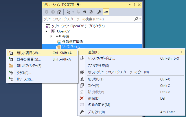 「ソリューションエクスプローラー」の「ソースファイル」の上で右クリックして、 ポップアップメニューから「追加」-->「新しい項目」を選びます。