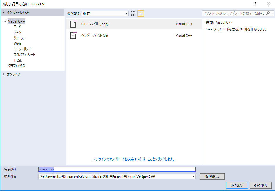 "Visual C++" の "C++ファイル (.cpp)" で、名前は "main.cpp" として「追加」をクリックします。