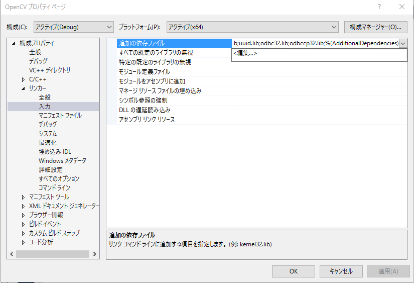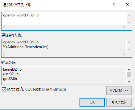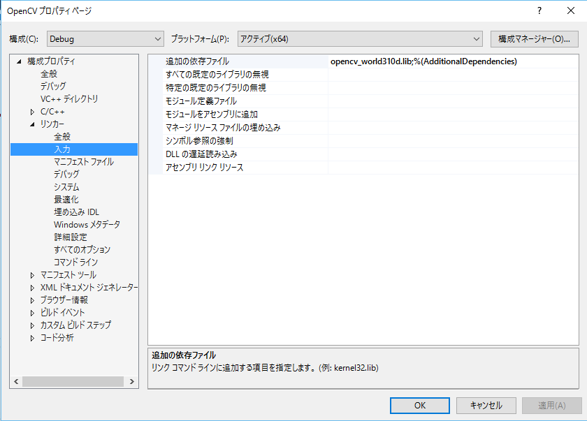 [注意] もしもReleaseモードでプログラムを実行する場合は、 opencv_world310d.lib ではなく、 opencv_worl310.lib をReleaseモードのプロパティで指定しなくてはいけません。