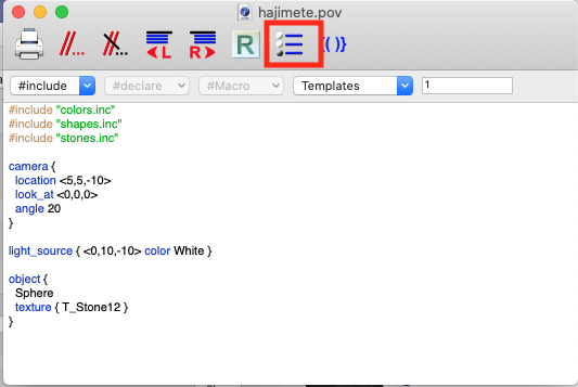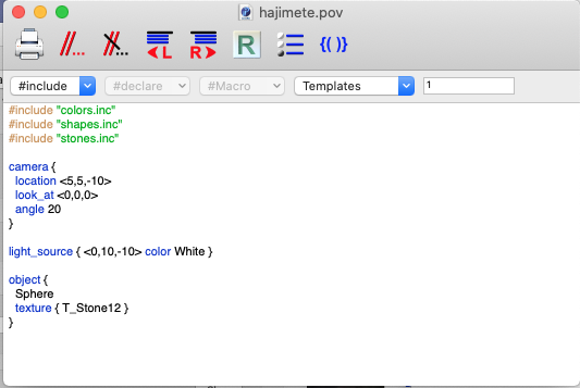 - "/Users/nitta/Documents/class.2022/2proj/hajimete.pov" を作成して、クリックすると POVRay の Editor が起動する。