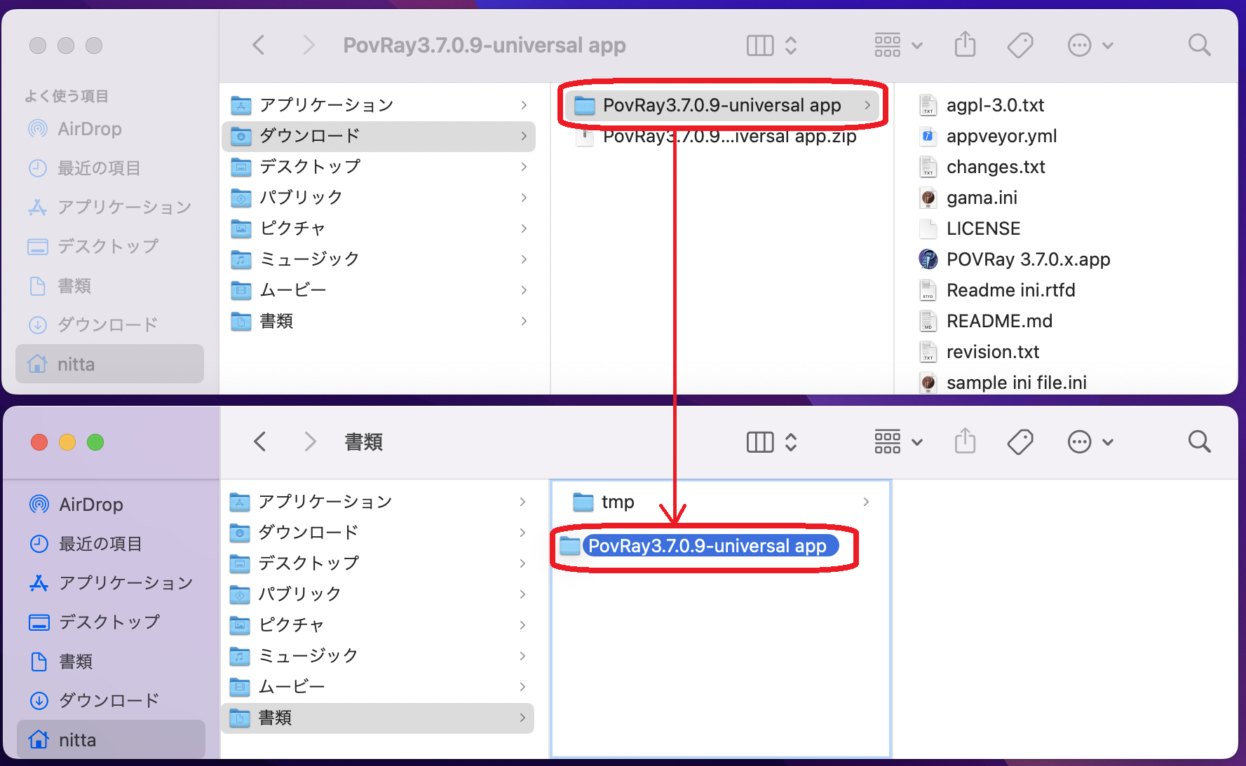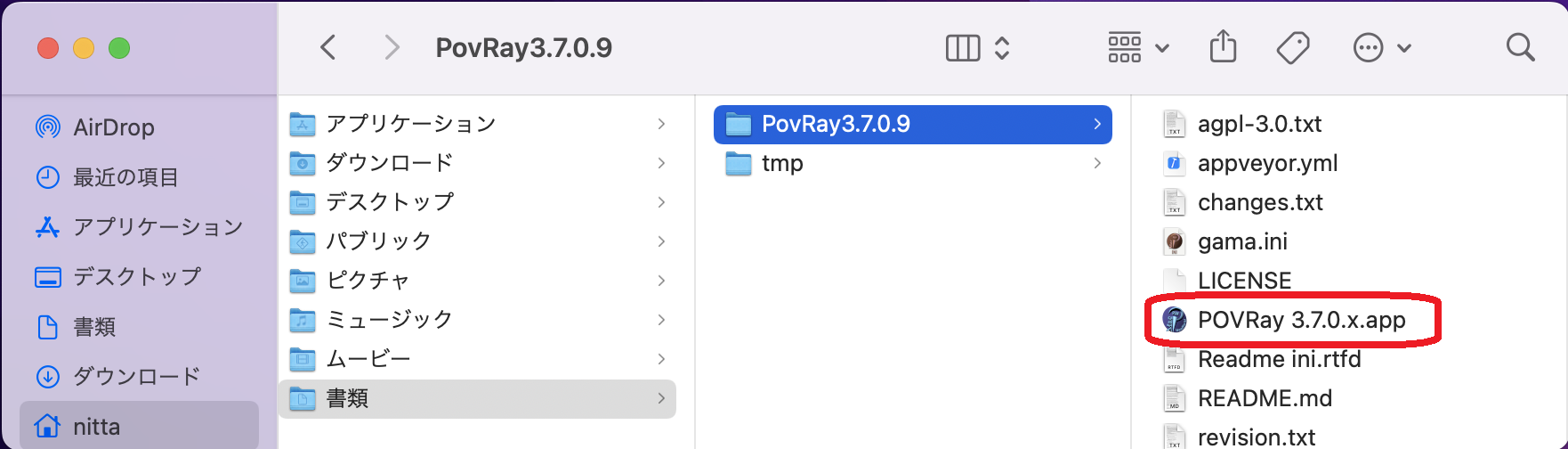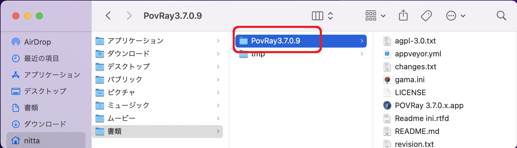 - 以下では「ダウンロード」の下に展開したフォルダの場所を移動し、/Users/nitta/Documents/PovRay3.7.0.9/ としたものとして話を進める。