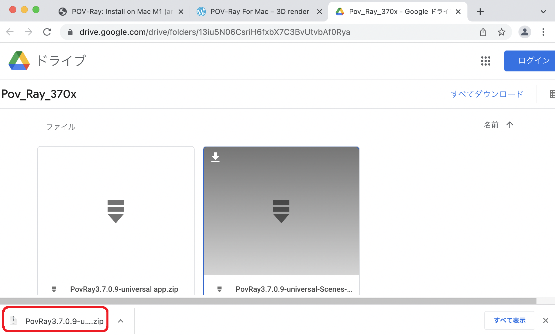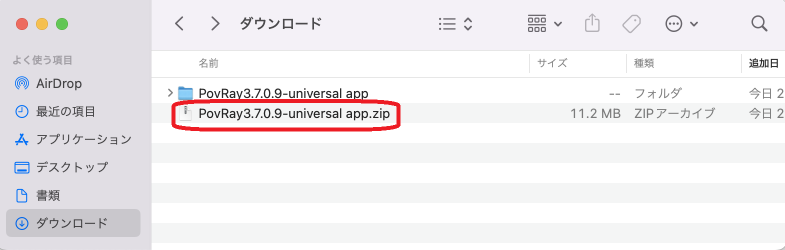- chromeブラウザの場合は、ダウンロードした "PovRay3.7.0.9-universal app.zip" ファイルがウィンドウ下部に表示されるので、それをクリックすると展開して PovRay3.7.0.9-universal app/ フォルダが作成される。