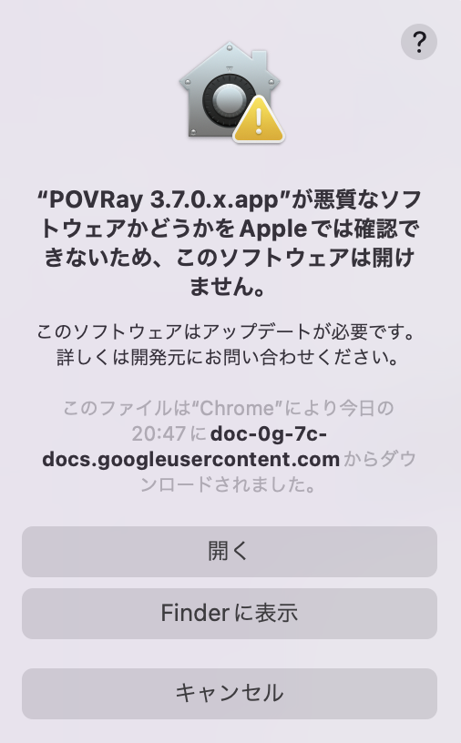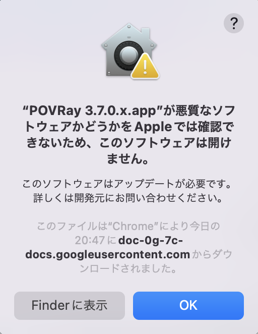 - セキュリティのため、POVRay は起動できないという警告が出力される。