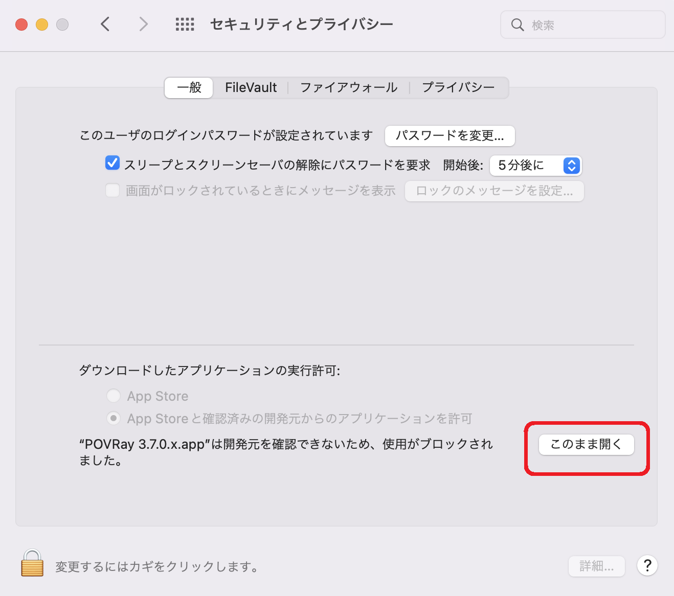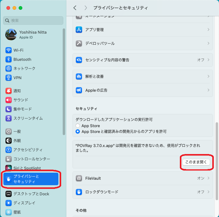 - POVRayを起動できるように、「システム環境設定」から「セキュリティとプライバシー」の設定を変更する。