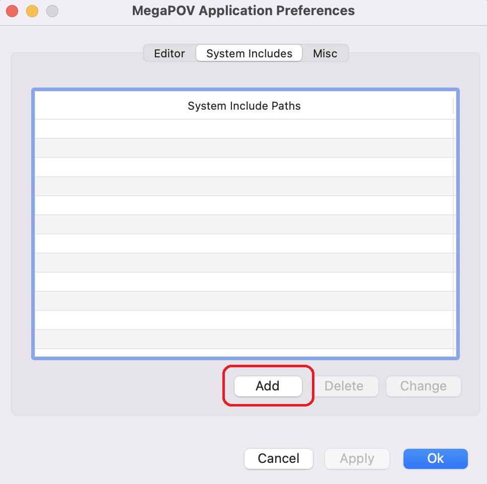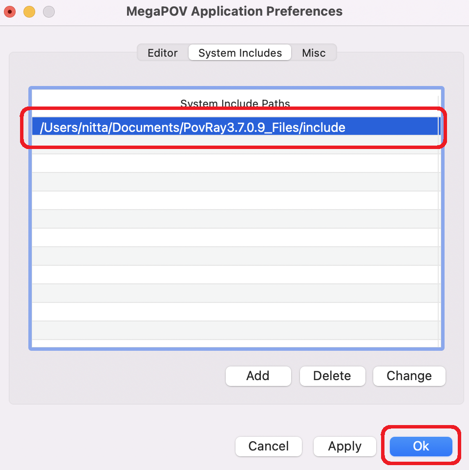 - "MegaPOV Application Prefrences" ウィンドウの "System Include Paths" に、POVRay フォルダのincludeフォルダを「Add」する。 追加できたら「OK」
