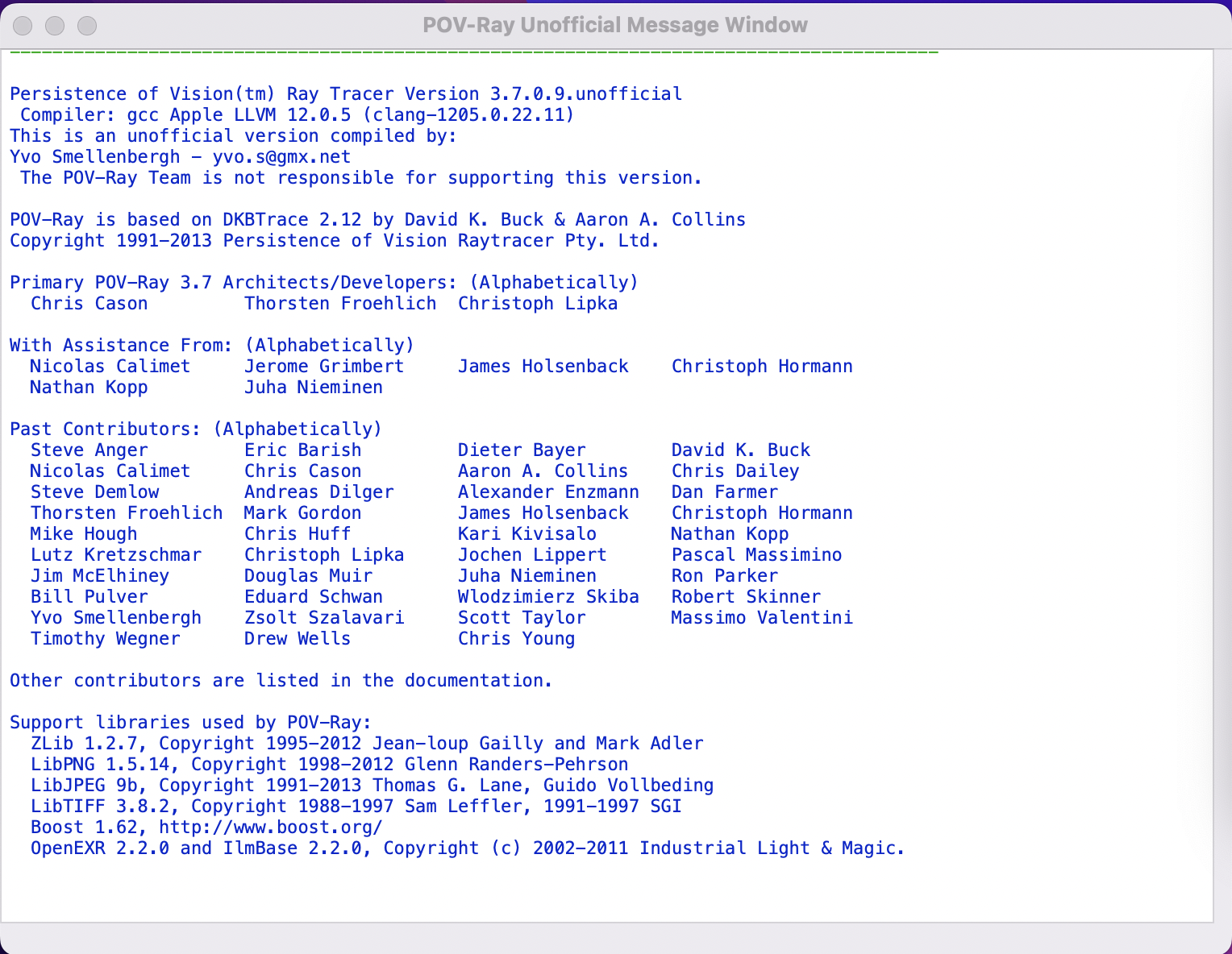 - "POV-Ray Unofficial Message Window", "Preferences for:" という2つのウィンドウが開くが、これらは無視して構わない。