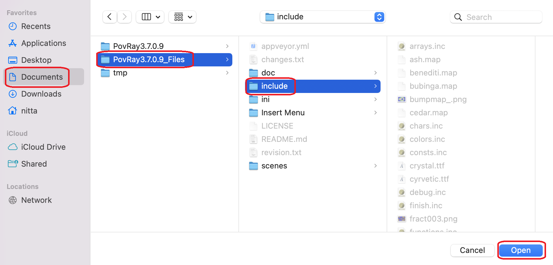 - 以下では「ダウンロード」の下に展開したフォルダの場所を移動し、/Users/nitta/Documents/PovRay3.7.0.9_Files/ としたものとして話を進める。