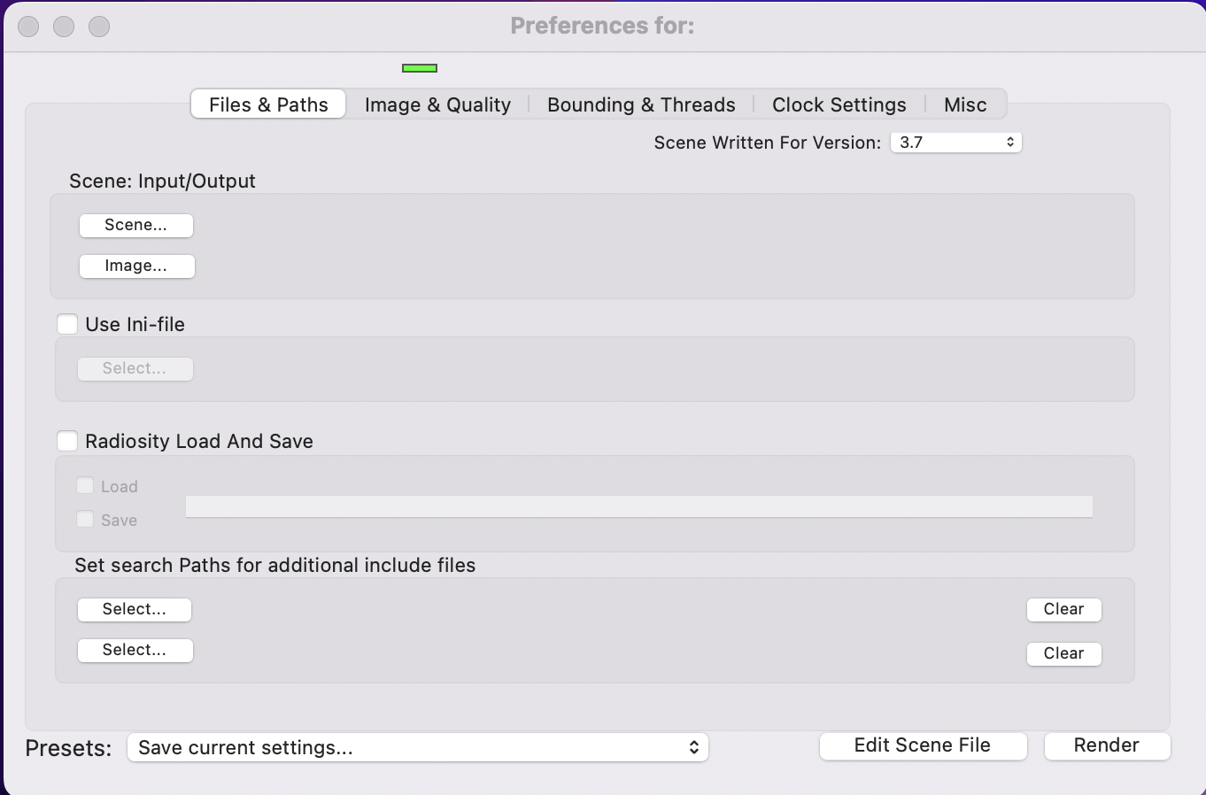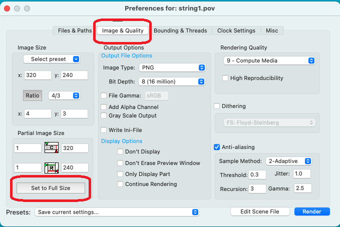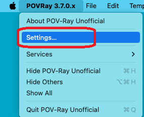 - POVRay の実行中に、画面上部のメニューから "POVRay 3.7.0.x" → "Settings..." (または "Preferences" )を選択する。