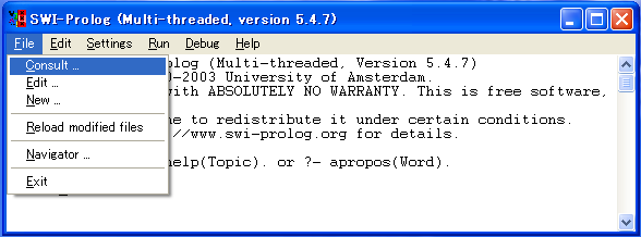 SWI-Prologのウィンドウのメニューで「File」→「Consult」を 選択するとファイルを選ぶウィンドウが開きますので、自分の 作成したファイルを選択して下さい。