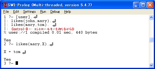 入力の終りでコントロールキーを押しならがDを押すときに、長く押しすぎるとProlog インタープリタ自体が終了するので注意。