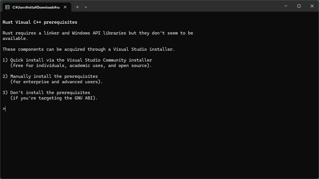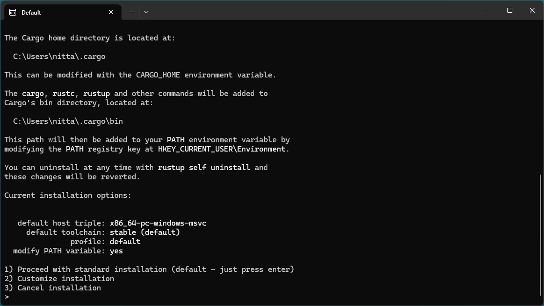 - Rust のインストール画面で "1) Proceed with standard installation" を選択する。