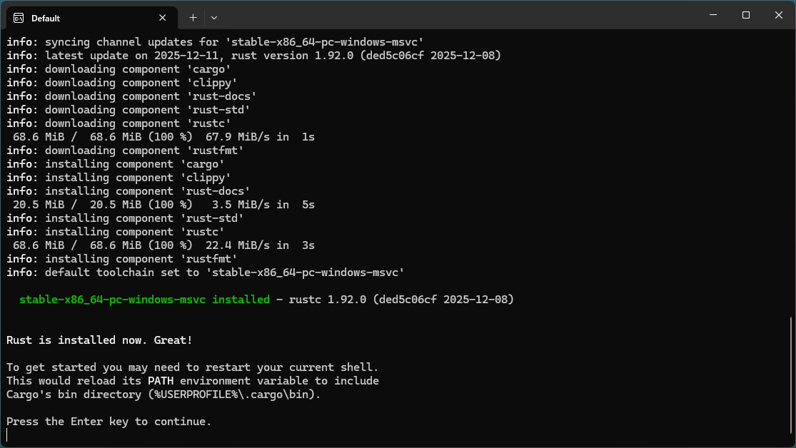 - Rust のインストールが終了する。PATH 変数を再ロードするために、シェルを起動し直すと cargo コマンドが使用可能になっている。