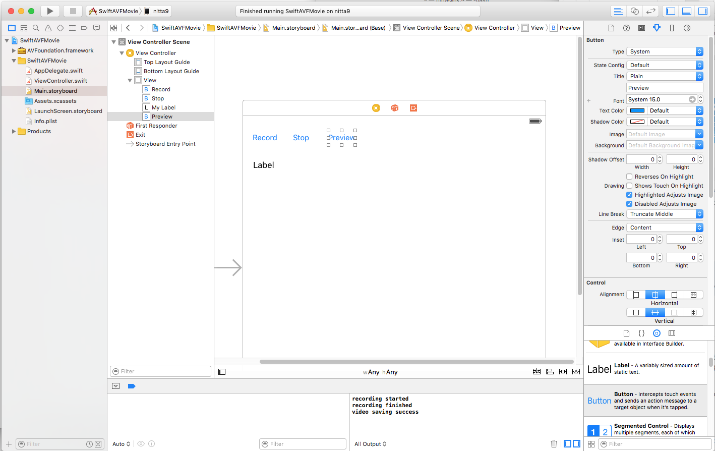 AVFoundation フレームワークを使って動画を撮影し、保存する例です。 録画途中でのプレビューもon/off できます。