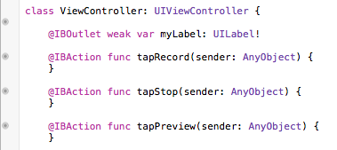 | Button "Record" | Action (Touch Up Inside) | tapRecord 関数 |