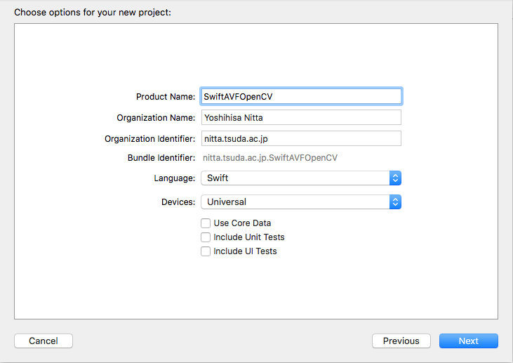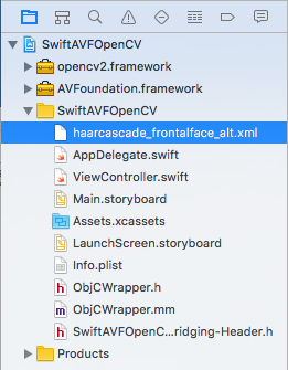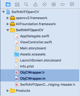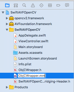 ObjCWrapper.h, ObjCWrapper.m, SwiftAVFOpenCV-Bridging-Header.h が新たに生成されました。