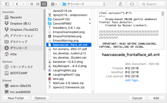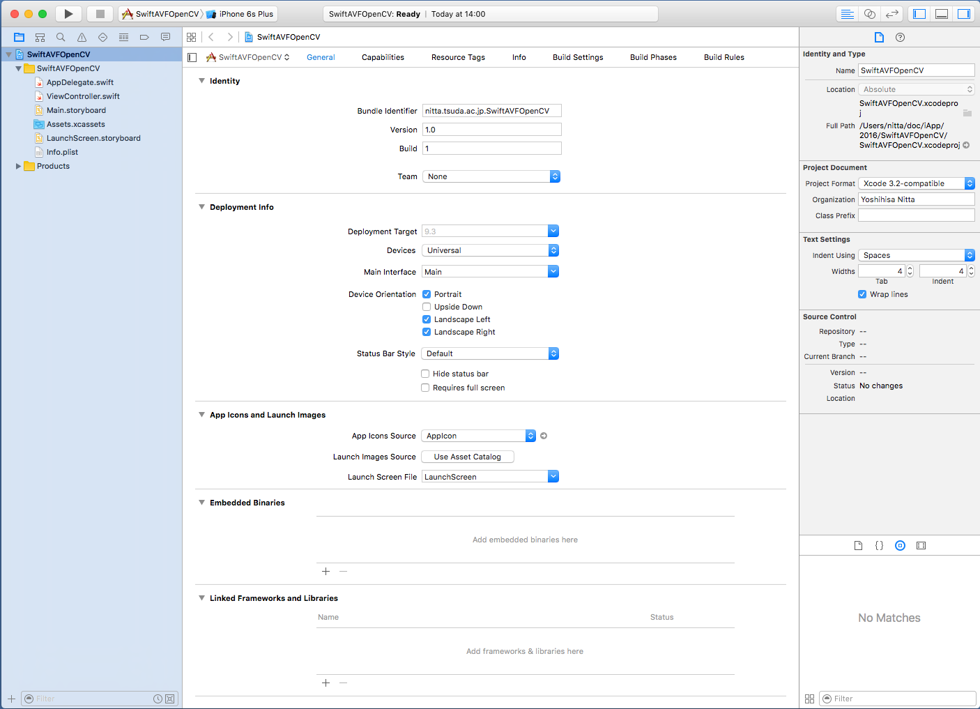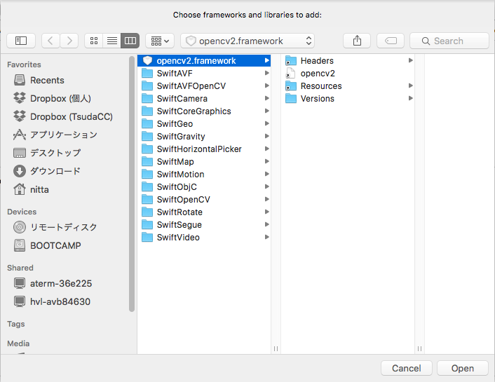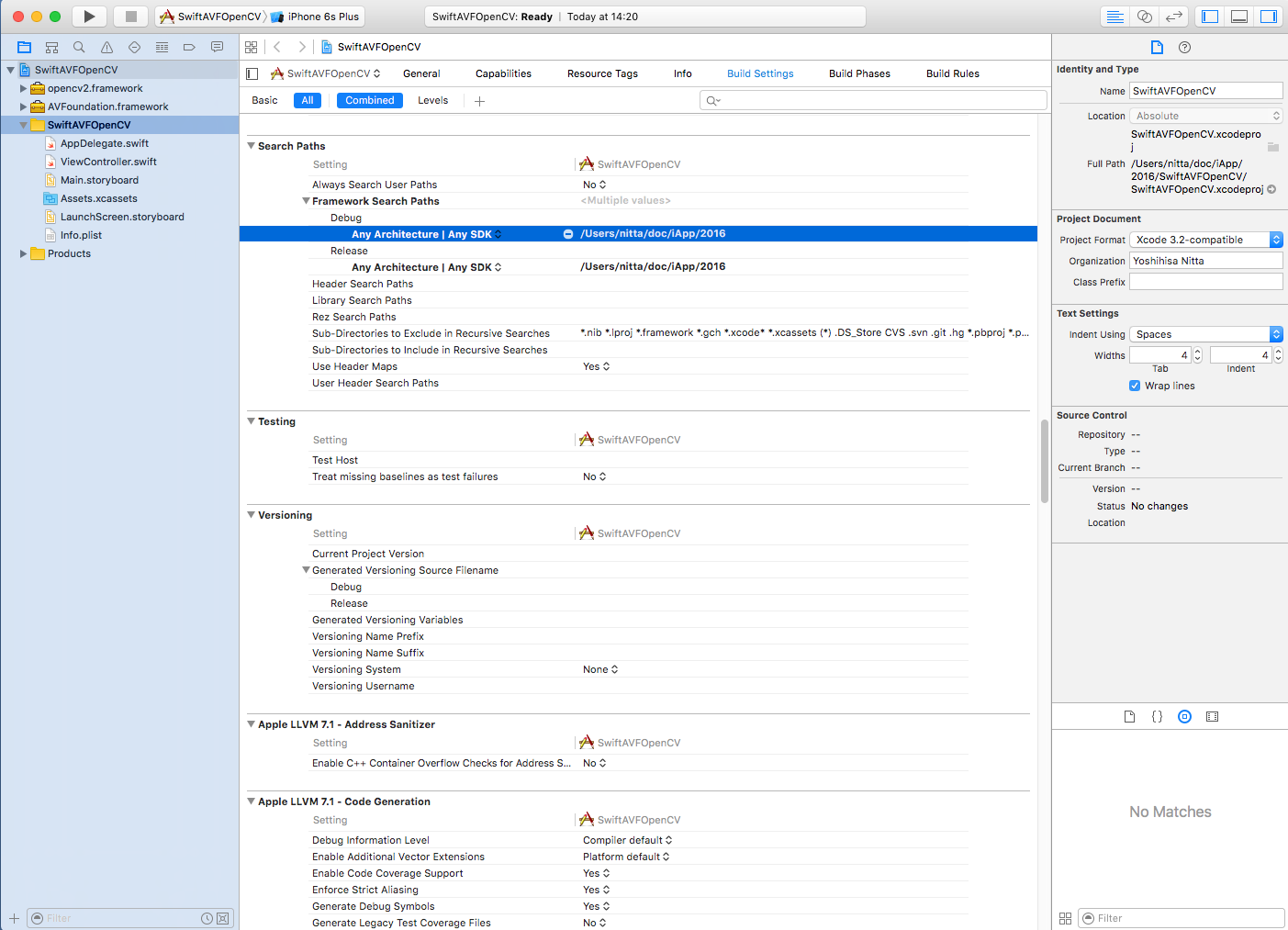 (注意) 追加したframework が認識されない場合は、プロジェクトの "Build Settings" -> "Search Paths" -> "Framework Search Paths" の "Debug" と "Release" の両方に opencv2.framework が存在するパスを付け加えましょう。(例では /Users/nitta/doc/iApp/2016 )