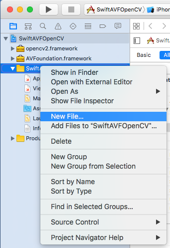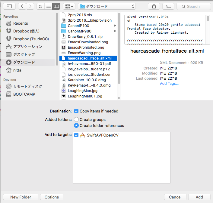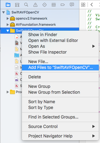 ウィンドウ左のProject Navigator でプロジェクトを選択して、マウスの右クリックで "Add Files to プロジェクト名"を選択します。 ファイル選択の画面ではまず Option をクリックして "Copy items if needed" にチェックをいれてから、Addします。