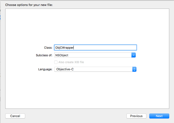 iOS -> Source -> Cocoa Touch Class -> Next を選ぶとクラス名の入力になります。ここではクラス名は ObjCWrapper、Subclass ofに NSObject, LauguageにObjective-C を選択しました。